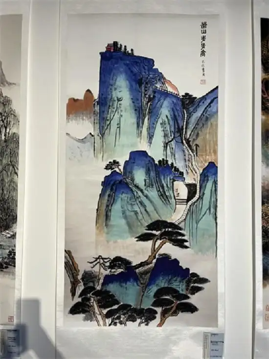 梁丽老师以石青、石绿的浓淡层次铺陈蒿山奇峰,青蓝叠嶂间,山石如翠玉般温润,又不失雄峻挺拔的气势。崖壁上的蒿山松以焦墨写干、浓墨点针,苍劲枝干破石而出,尽显蒿山松的坚韧风骨。蜿蜒的白描栈道从山脚盘旋至山顶,既勾勒出蒿山的地理意趣,更以“步步高”的意象,寄寓着向上求索的美好期许。画面留白取法文人山水的空灵,题款与印章则延续了中国书画“诗书画印”的审美传统。当这幅青绿山水立于迪拜的展厅,蒿山的雄奇与丝路的绵长相融,让东方山水的意境与哲思,成为中阿文化交流的生动语言,也让我们在笔墨间,读懂文明互鉴的温暖深意。