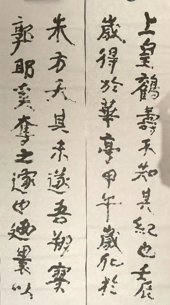 《一室琴声邀明月,半瓯清茗洗俗尘》这幅隐士自撰联也是隐士的代表作之一,从戊戌年、庚子年、癸卯年的作品中,分别写出了恬静、(见图十五)宽厚、(见图十六)古拙(见图十七)等不同书风的作品,特别是在创作甲辰年冬新作时,(见图十八),我们有幸目暏老师即兴挥毫,只见他眼睛时而闭时而睁,手上的毛笔仿佛在惚兮恍兮中挥动,渺渺茫茫,虽然随意信笔,但老师几十年的《毛公》篆籀底蕴,己化为高迈而儒雅,看似放旷恣肆而细品又能静穆至妙,神游物外!老师当时虽是左手握笔,但书作骨气洞达,势贯首尾,从上联的首字“一”,到下联的末字“尘”,气息一脉相承;“一”字负阳抱阴,“尘”字向右倾斜,最后一笔横负阴抱阳。首字与尾字阴阳相合,如天地、如太极...原来,书中有道,道书浑通,倾刻间,一幅不着安排、不思刻意、不求讨好的高境界的对联作品自然天成。正如本文标题所说的“赏隐士书法,把字写到了没有书写的痕迹”。