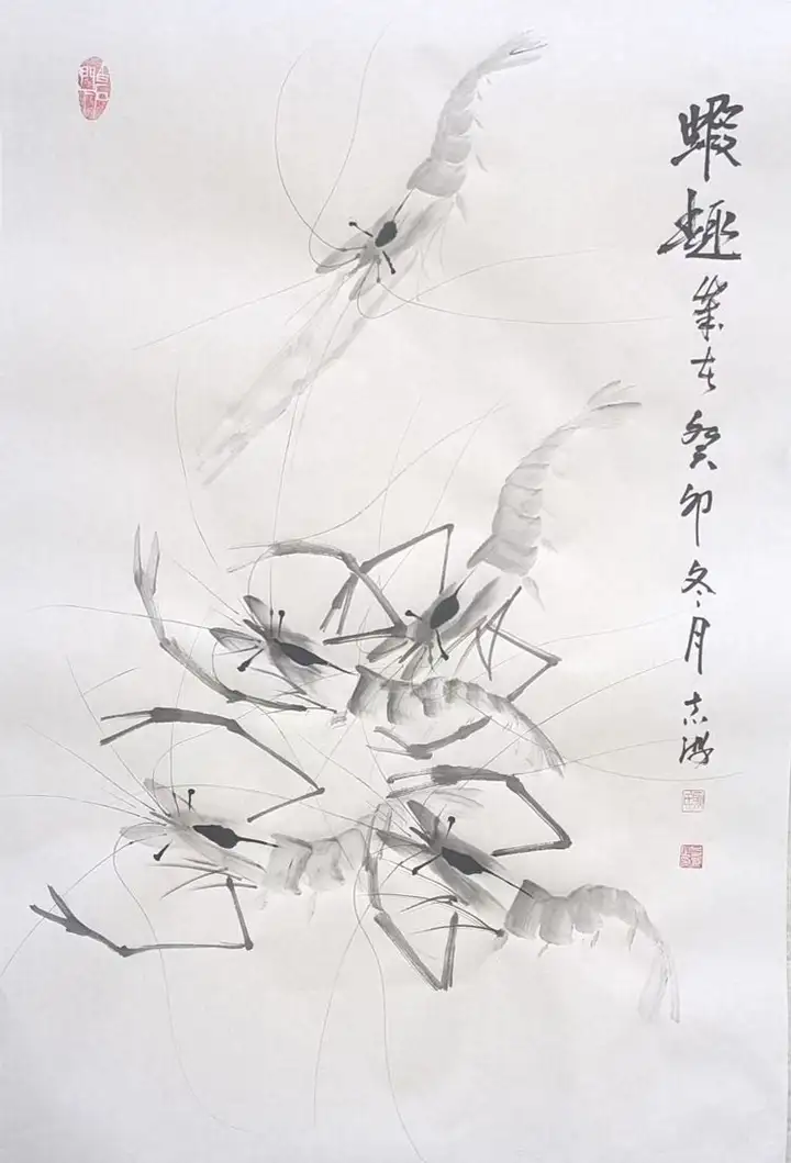 观其虾画,墨色浓淡相宜,笔法细腻而富有变化。每一只虾都各具姿态,有的悠然自得,有的嬉戏玩耍,有的奋力前行,充满了生命力。耿志海老师通过对虾的描绘,表达了对自然的敬畏和对生命的赞美。