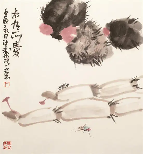 一直以来,其创作首先以“简”为基本特质,对形和特定神态的把握,并加以提炼概括,驻力点睛于表现物象的形态之上,并以追求写意及传神为至高,再注入自身所领悟的审美意趣,藉以寄意抒情。这种对鲜活生活与社会的体悟及对当下审美趣向的体认,令卜绍基的画作既可见沉稳的传统笔墨功底,又能有不墨守成规,脱出藩篱的大胆突破而富于新意而呈现出一派勃然生机。观者能在花果枝叶的穿插中,在笔墨挥洒的蕴涵节律之中,通过墨色的微妙变化及水分的恰当运用,生动表现物象的形神意象。其所呈现出的审美意味,正是他在绘画过程中对构图造型、笔墨技巧等外部手段因素以及精神感情、情致内涵等内在情感的概括化、精神化和写意化。所以只要细品其中,你便可感受到其画中运笔走势、墨色表现以及构图造型所具有的“鲜活”气息和“写意”韵致。
