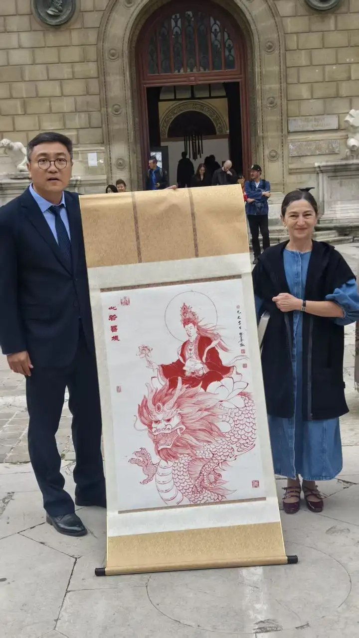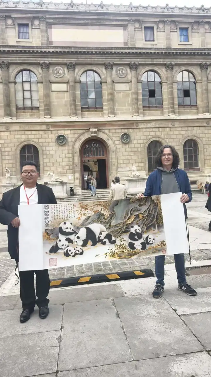 下午13:00巴黎国立高等美术学院绘画系主管、教授:阿梅尔·普拉达利尔女士(Ms. Armelle Pradalier)和绘画系教授:埃米尔·杰罗姆先生(Mr.Émile Gérôme ),在学院学习宫前方的广场上与中国艺术家代表团举行了艺术作品收藏仪式并合影留念,现场学院师生也纷纷驻足观看,共同见证这一难忘的时刻。