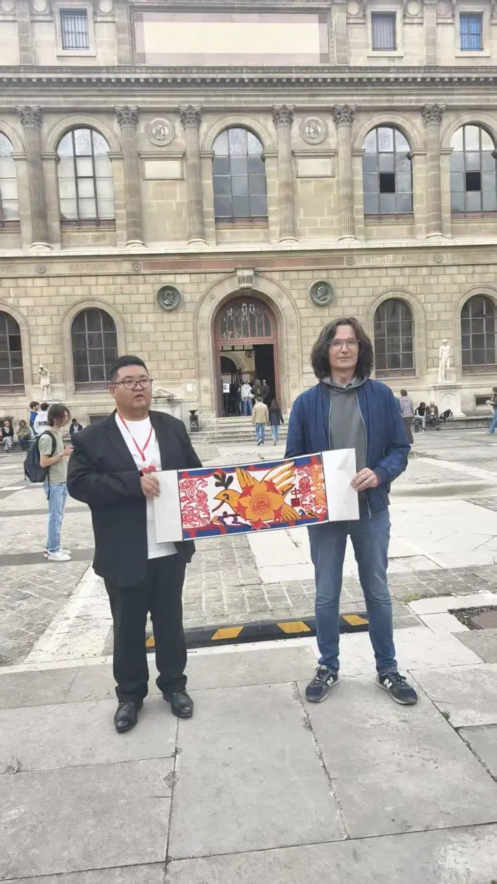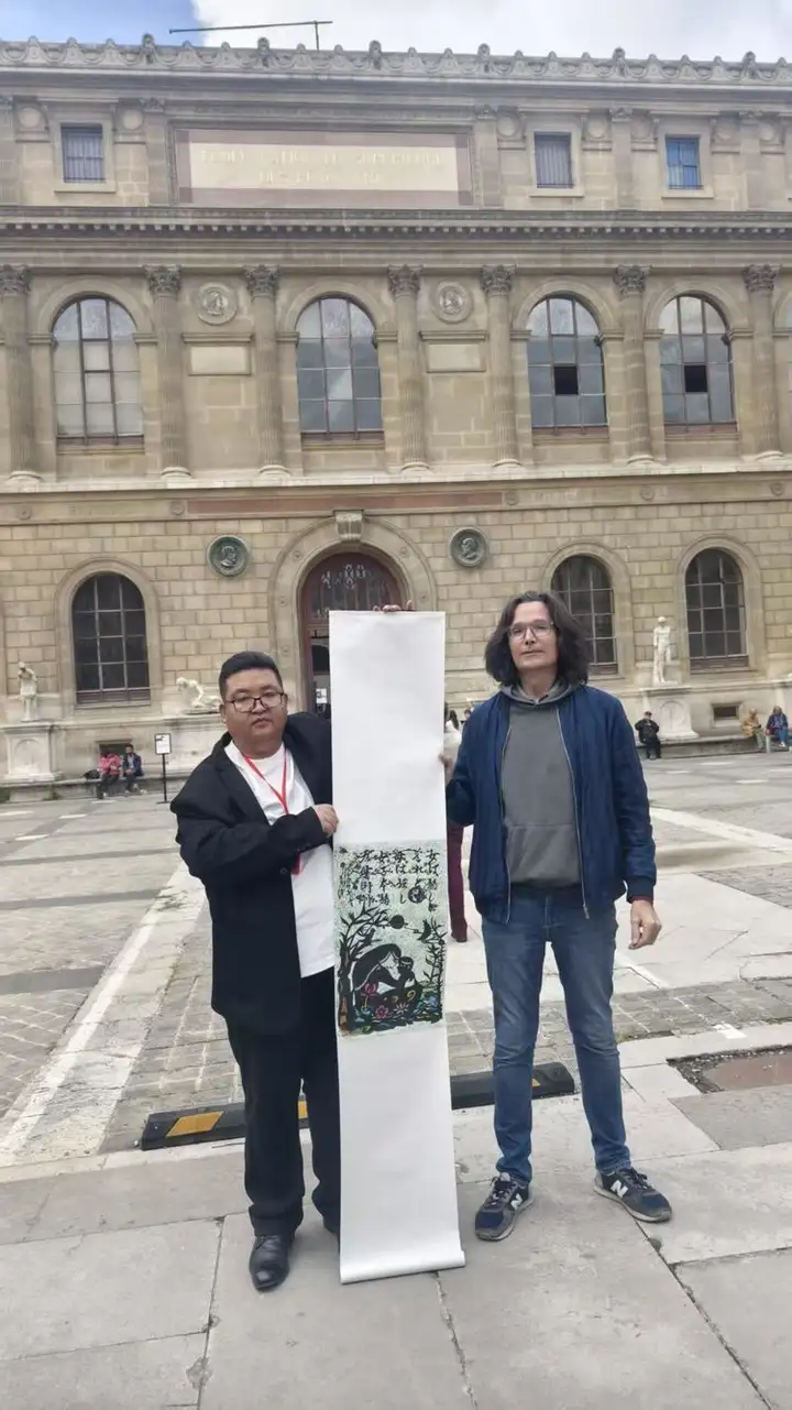 下午13:00巴黎国立高等美术学院绘画系主管、教授:阿梅尔·普拉达利尔女士(Ms. Armelle Pradalier)和绘画系教授:埃米尔·杰罗姆先生(Mr.Émile Gérôme ),在学院学习宫前方的广场上与中国艺术家代表团举行了艺术作品收藏仪式并合影留念,现场学院师生也纷纷驻足观看,共同见证这一难忘的时刻。