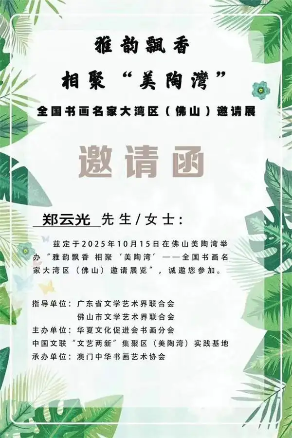 “雅韵飘香 相聚美陶湾”——全国书画名家大湾区邀请展2025年10月15日在广州佛山美陶湾文化创意产业集聚区开幕。本次展览以笔墨丹青勾勒千年陶都的文化脉动,推动文化交流与融合,展现美陶湾文化艺术创新的蓬勃生机。