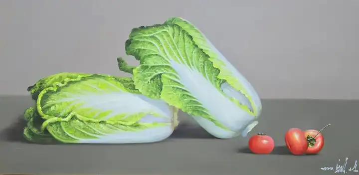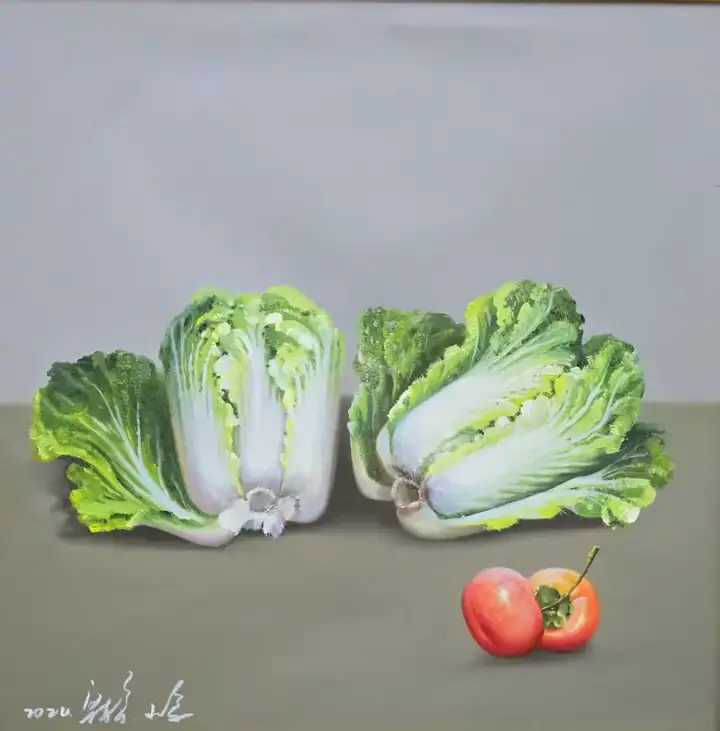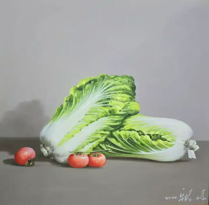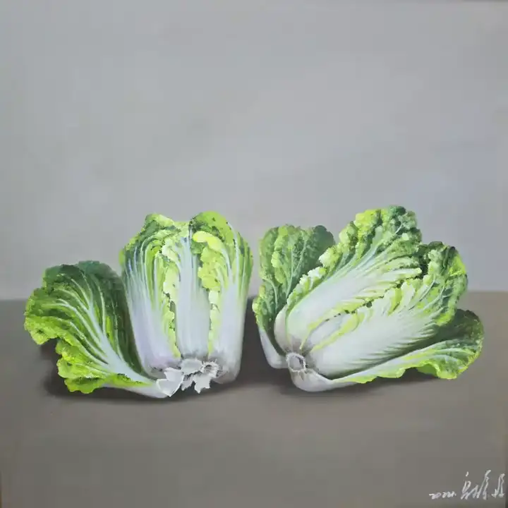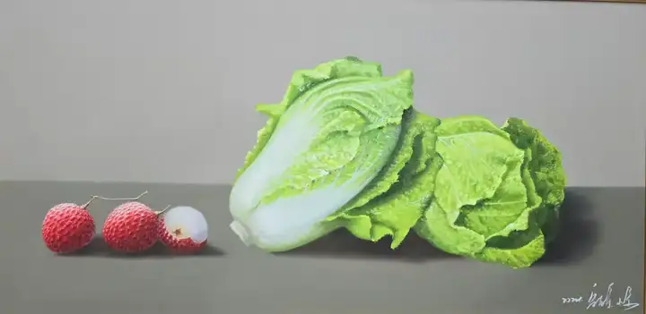 我画的不是 “白菜”,而是 “白菜所承载的生活质感”;我刻画的不是 “荔枝”,而是 “荔枝所凝结的自然精妙”。当观者在画布前为一颗白菜的肌理驻足时,实则是在与 “日常的诗意” 对话 —— 这便是我的创作野心:让平凡果蔬在超写实的语境中,获得超越世俗的艺术尊严。