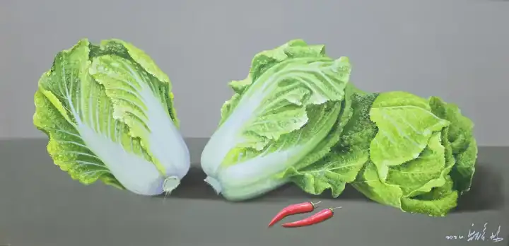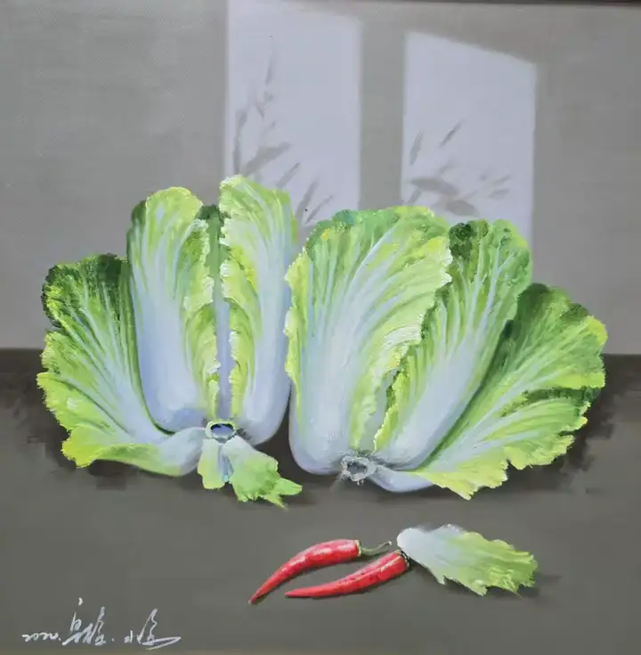 《三棵白菜与辣椒》:三颗白菜的不同形态(完整、半开)丰富视觉层次,辣椒点缀强化生活气息,绿色系的层次变化细腻入微。