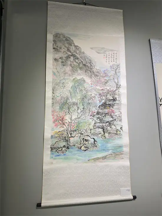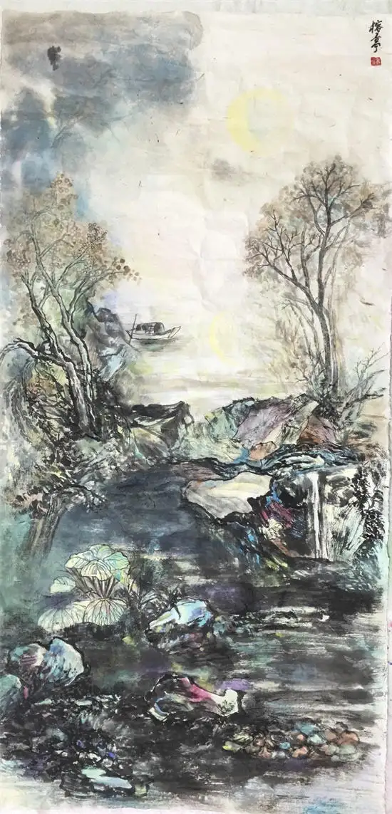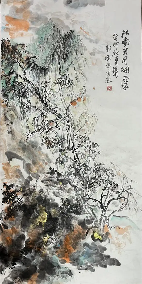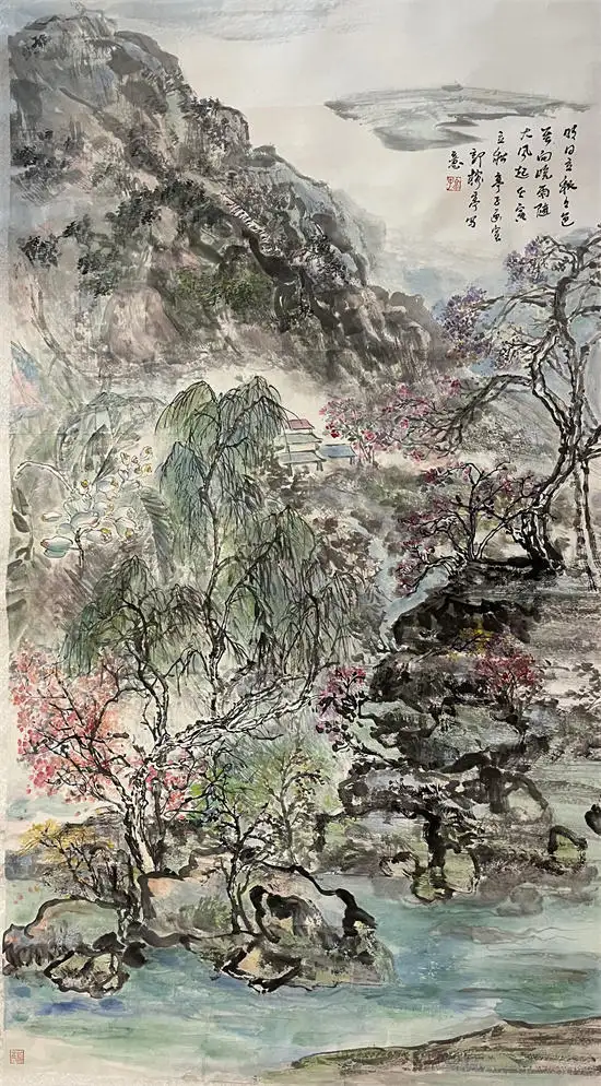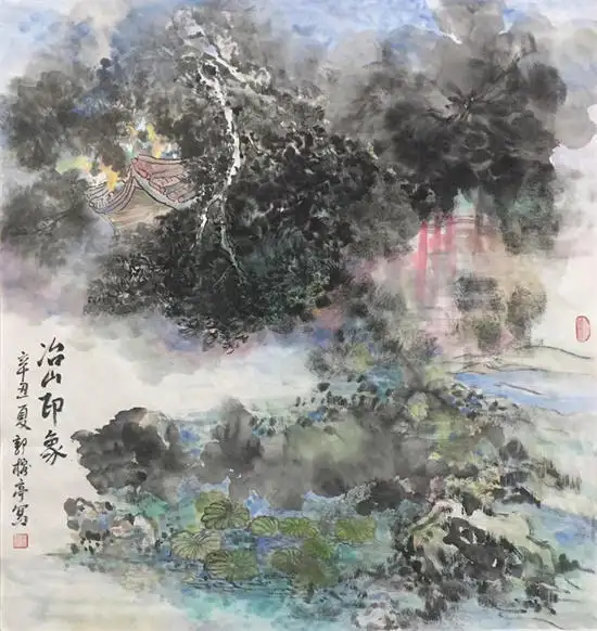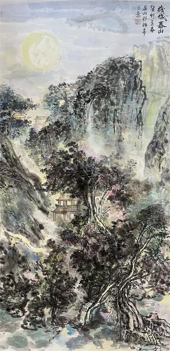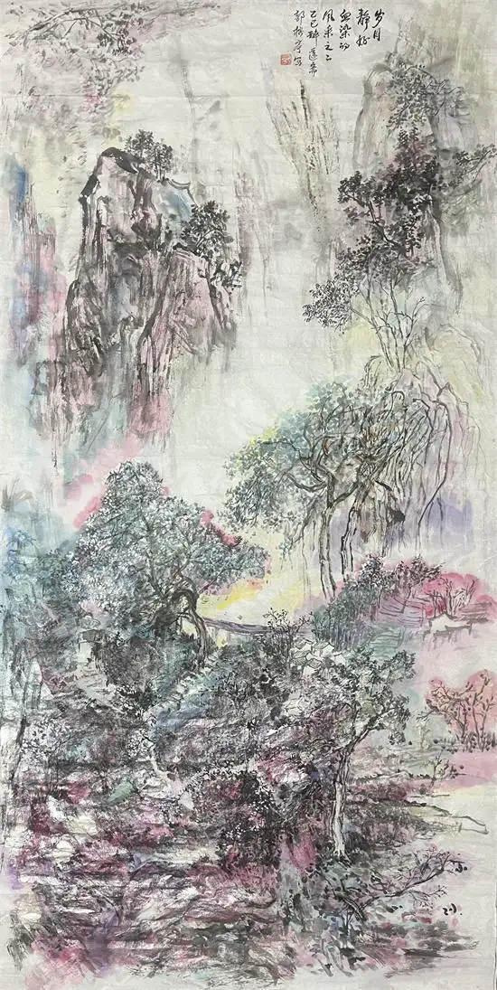 此次参展的作品中,郭榕亭老师以抗战历史为背景,运用她擅长的彩墨山水风格,将自然景观与人文情怀巧妙融合。画面中,既有山川的壮丽,又有历史的厚重,笔墨的浓淡干湿、笔墨的抑扬顿挫变化、中国画的笔墨韵味;她笔由心生、由心入画,又不失个性化的笔墨符号,尽显她笔下的中国水墨之力量美,让观者在欣赏艺术之美的同时,也能感受到那段历史的震撼与感动。