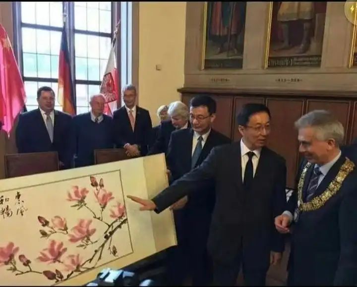 时任上海市委书记韩正出访德国。将国礼画家胡乐平的(紫玉兰)作为国礼赠送法兰克福市长