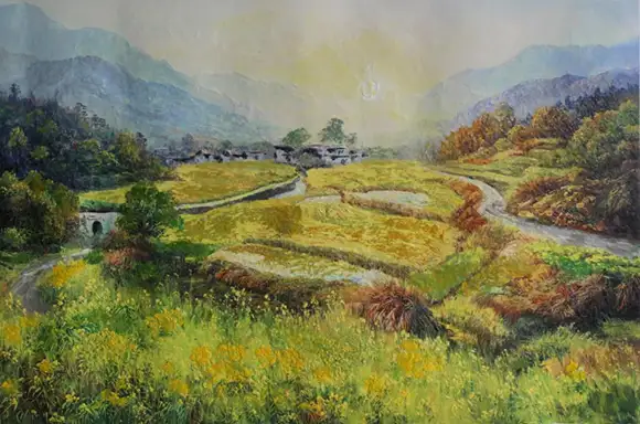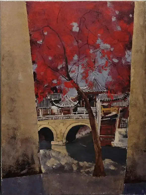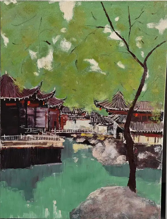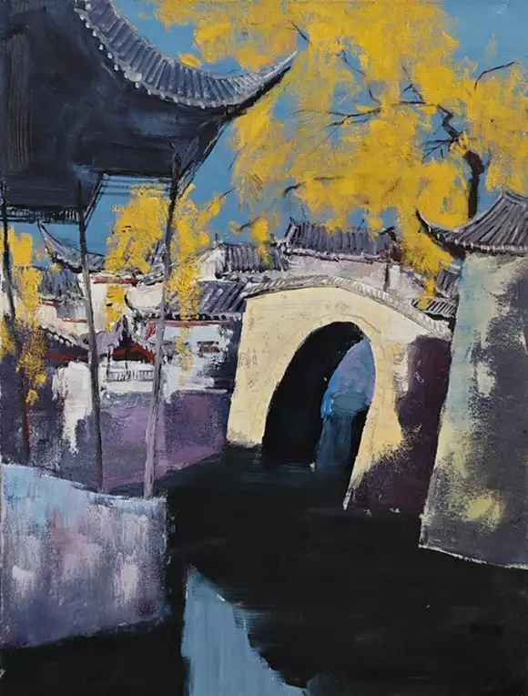 泼彩转译技术:将金陵画派的泼彩精髓用油画颜料重构,层叠罩染与肌理刮擦结合,让江南晨雾的虚实浓淡跃然画布,既有水墨的流动感,又有油画的色彩饱和度。