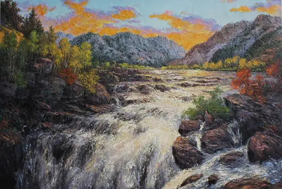 墨彩风景系列:墨彩油画技术的集大成者,《湖山霞韵》《山外青山楼外楼》等代表作被国家博物馆收藏,山水间的光影流转,尽显 “沉郁苍古” 与 “大气磅礴” 的双重气质。