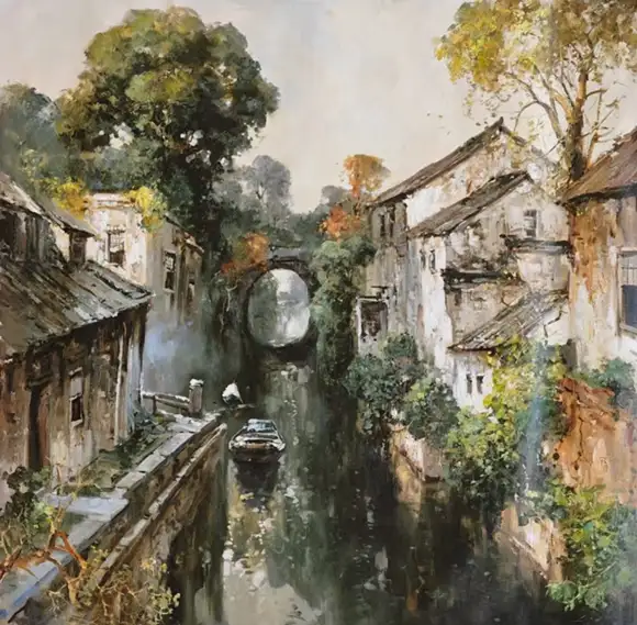 写生水乡系列:泼彩转译技术的经典呈现,江南晨雾的朦胧意境被精准捕捉,虚与实的交织间,藏着东方美学的含蓄之美。
