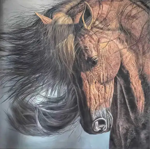 写意肌理手法:借鉴中国画 “以线塑型” 的精髓,用颜料点涂与油彩勾勒制造肌理,骏马的鬃毛蓬松灵动,肌肉线条遒劲有力,完美平衡了写意的神韵与写实的质感。