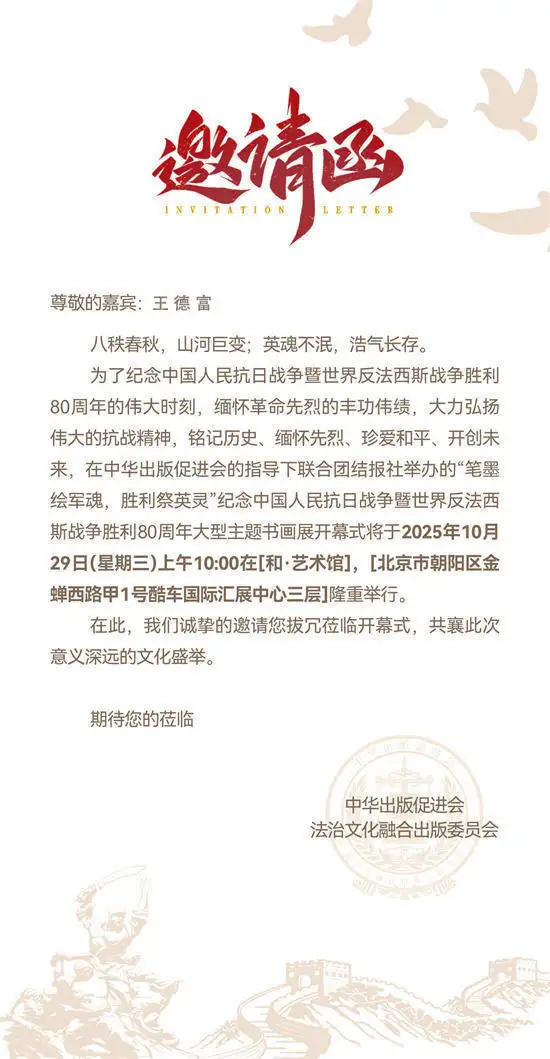 丹桂飘香,2025年10月29日,在纪念中国人民抗日战争胜利80周年的重要时刻,一场以“笔墨绘军魂,胜利祭英灵”为主题的大型主题书画展在北京和·艺术馆盛大开幕。本次展览汇聚了众多当代著名书画艺术家的精品力作。