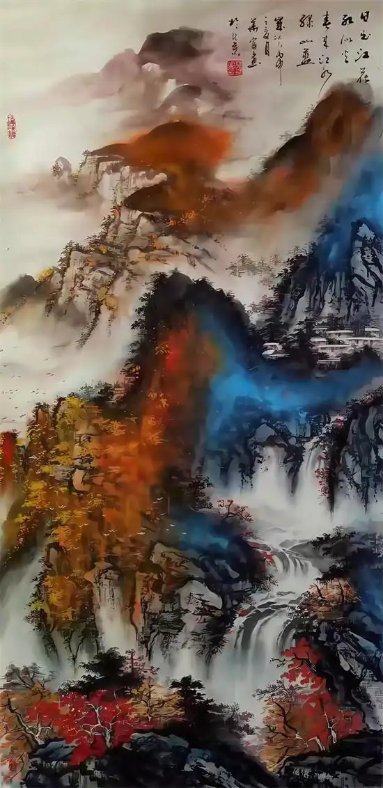 本次展览汇聚了众多当代著名书画艺术家的精品力作,蒋华富老师作品《日出江花红胜火》以其独特的艺术风格和深刻的文化内涵,成为展览中的一大亮点。