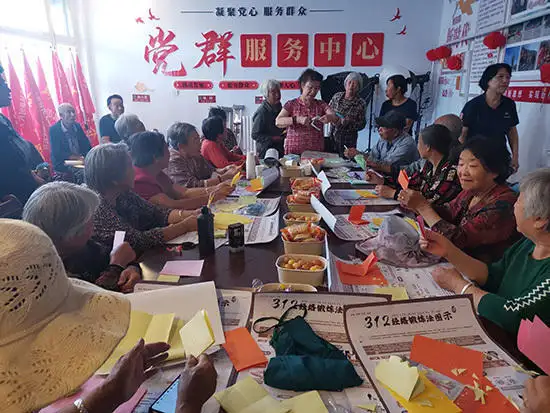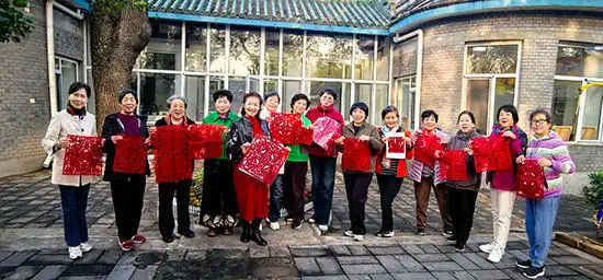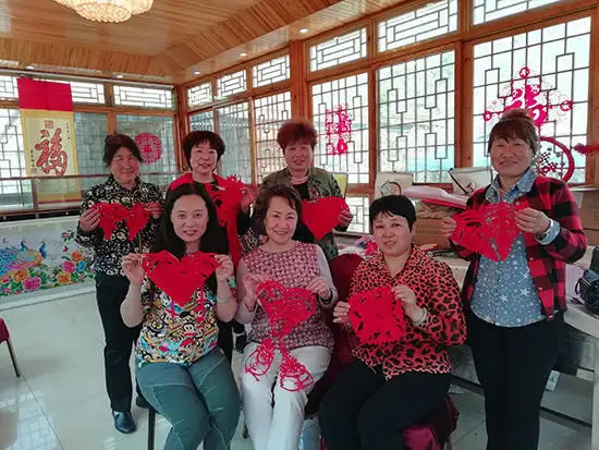 2023年8月在河北尉县桃花红互动养老服务中心为老人剪纸活动。