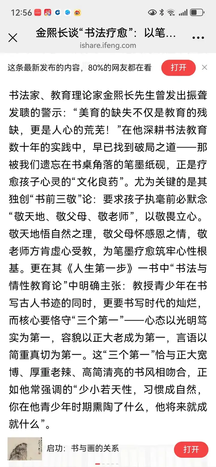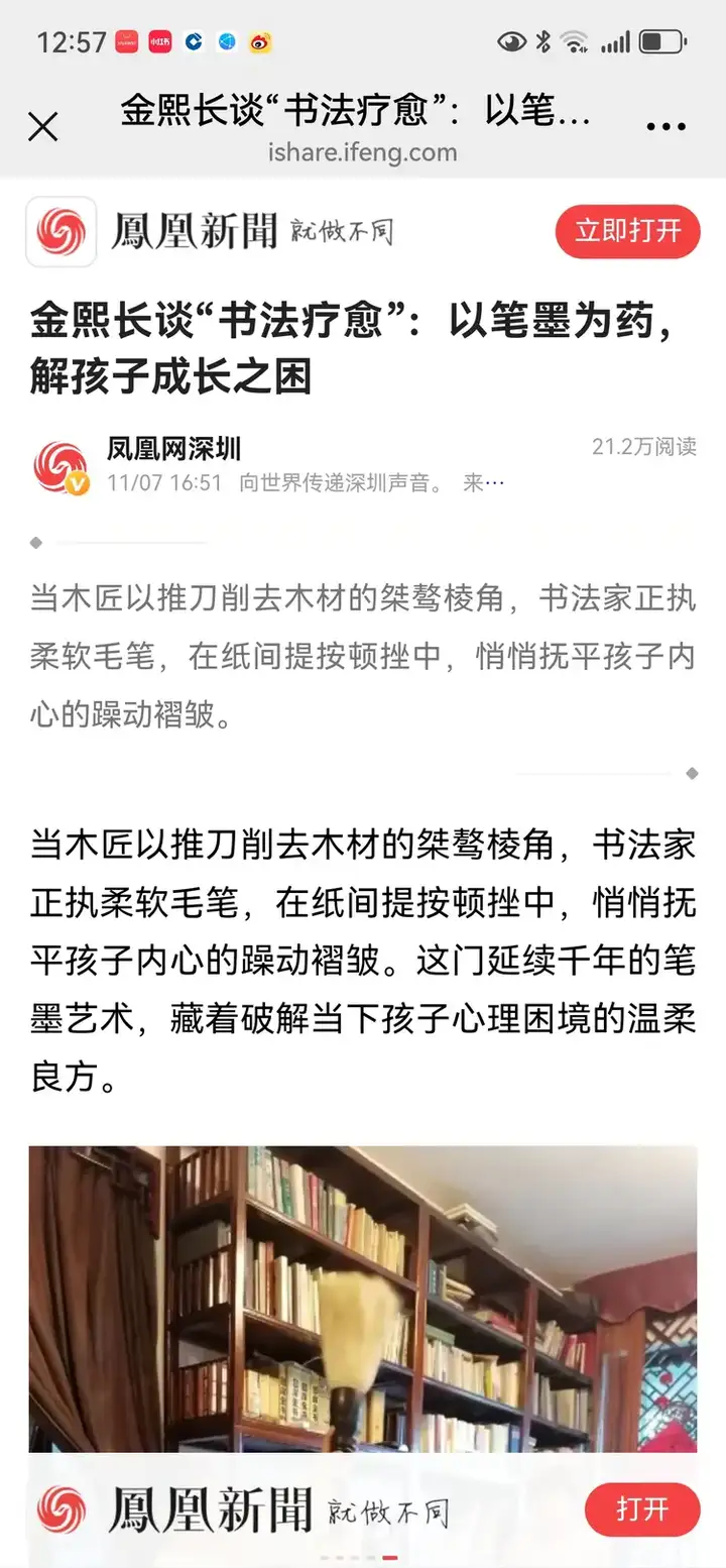 (上图:《金熙长谈书法疗愈》一文在《凤凰新闻网》报道后,不到一天时间,阅读量已超20万!)