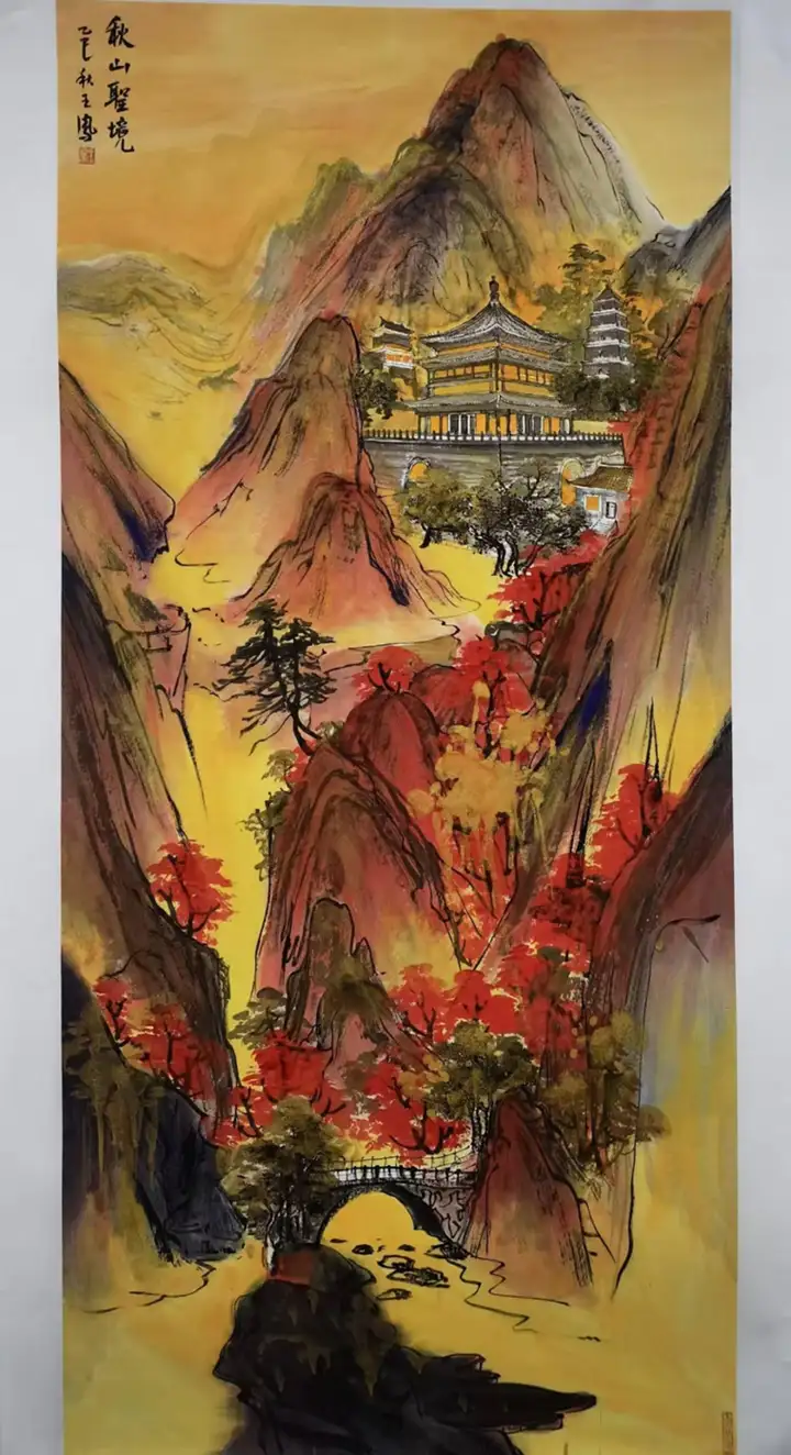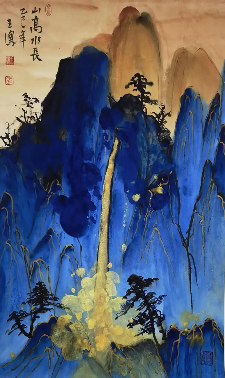 巴黎艺术评论界对其技法创新尤为关注:作品中既可见传统“勾勒填色”的严谨笔墨,又能发现水墨晕染与现代色彩构成的碰撞——金色松枝的肆意泼洒、青绿山峦的抽象变形,让千年古技法在当代语境下焕发新生。法国艺术策展人皮埃尔·杜邦评价道:“王凤的作品是‘可触摸的东方诗性’,她把中国山水的空灵意境,用极具冲击力的视觉语言翻译成了全球艺术圈都能读懂的表达。”
