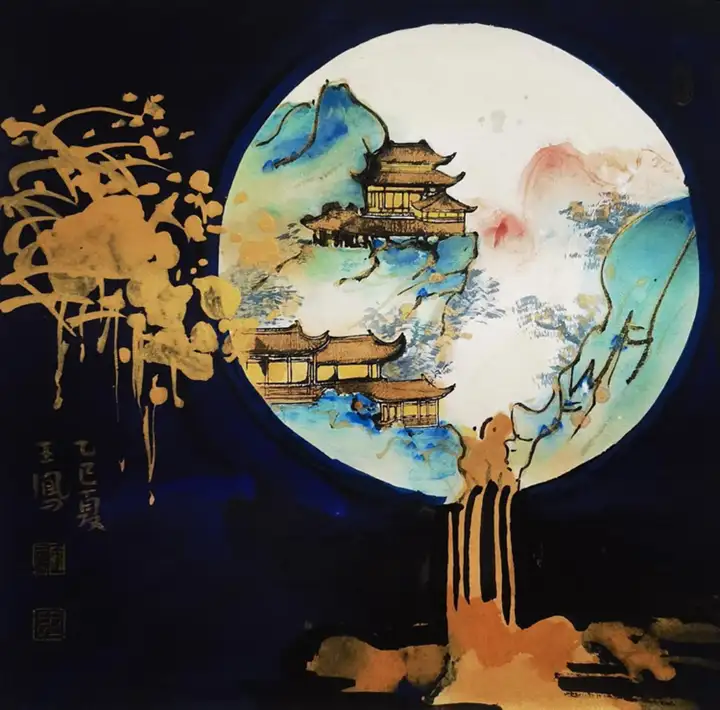 此次参展的《金辉玉嶂映清宵》《月轮金枝锁琼楼》等系列作品,是王凤“金青幻古”风格的典型代表。她以宋代青绿山水的雅致设色为骨,取唐代金碧山水的华贵金饰为魂,在宣纸之上构建出“月色熔金、山峦叠翠”的奇幻意境。