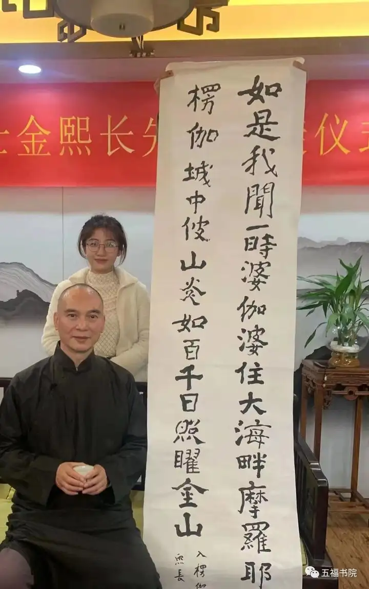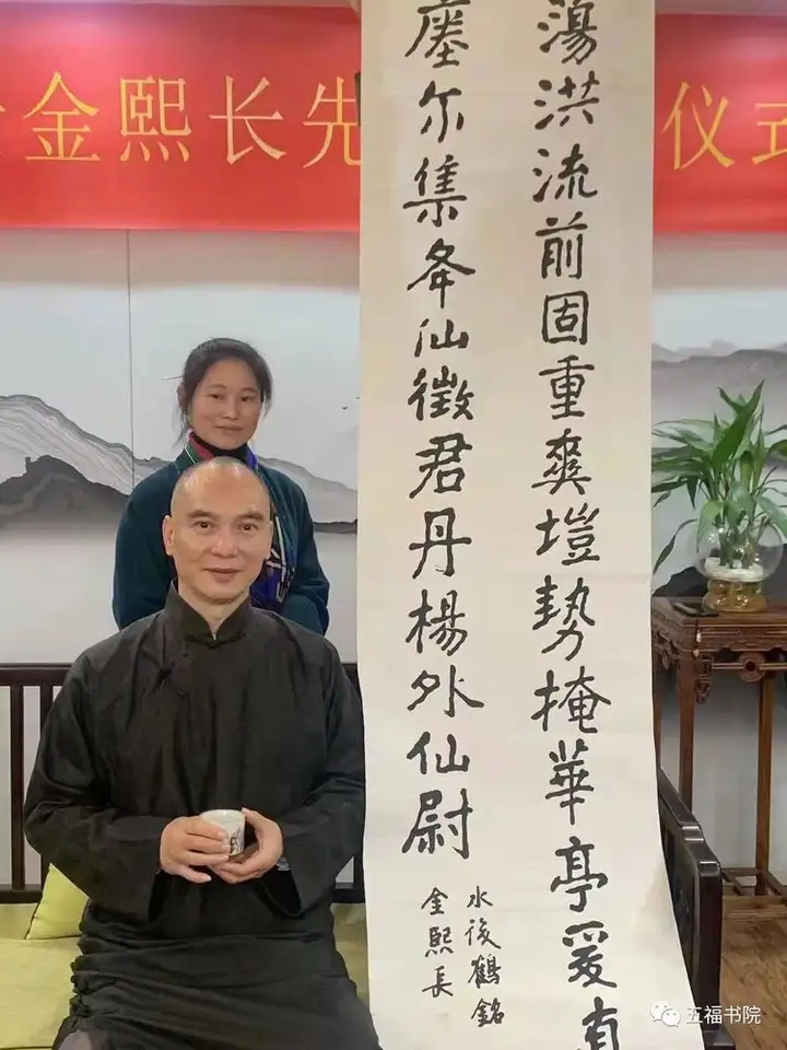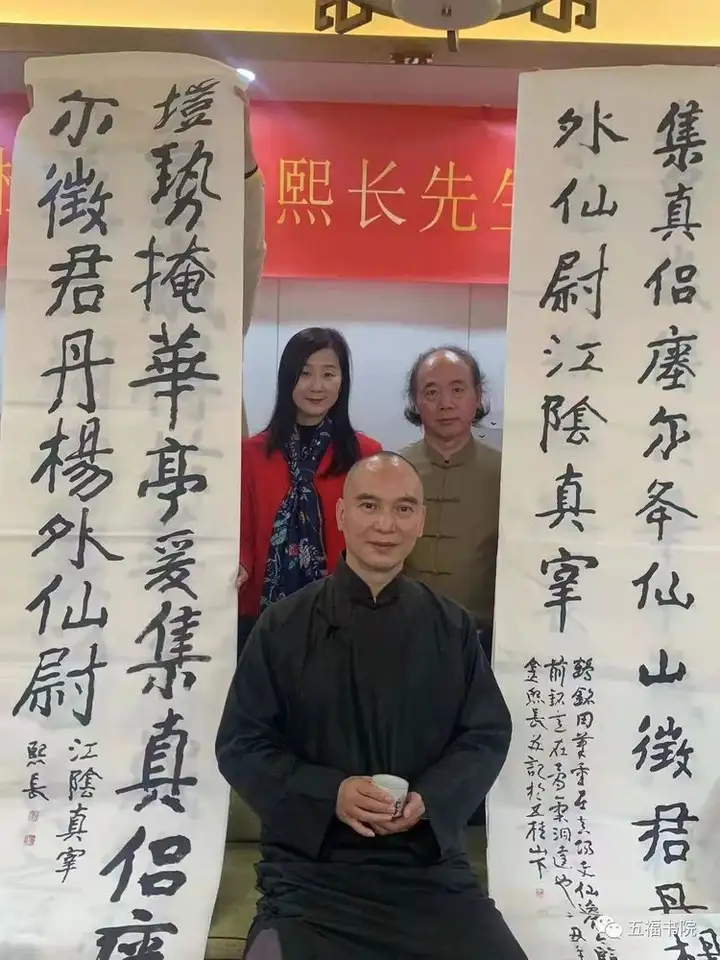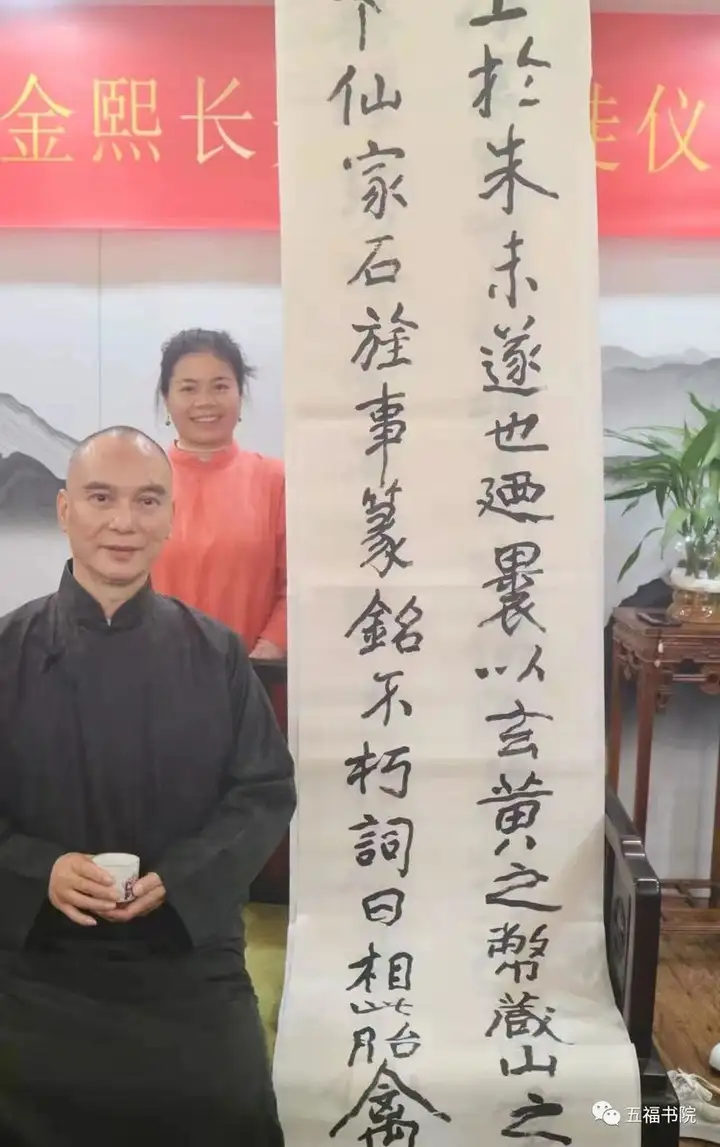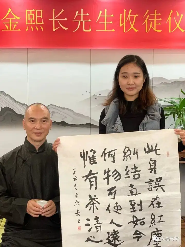 今天我们欢聚在这借由铭日大厦这块风水宝地,共同来见证这个具有人生意义的时刻。做为老师的弟子我首先来做个发言。在中华上下五千年的历史长河中,历代先贤为我们铸就了无数的辉煌,在书法长河中也为我们留下了许许多多的宝贵遗产;但同时其间也留存给我们一些无奈的谜团。诚如八集纪录片《千年书法》中有句话“大字首推《瘗鹤铭》”。而这千年谜碑《瘗鹤铭》的书写者也便成为了一个千古之谜。但在2020年《仙家书法<瘗鹤铭>考证》一文横空出世,轰动当今书坛,而此文作者正是我们的老师金熙长先生。老师在本文中详尽阐述并考证了《瘗鹤铭》的作者正是“陶弘景”。可见我们老师的博学与才识值得我们骄傲。各位师兄,我们是幸运的,因为我们遇见了一个真才实学并具大家风范的好老师。在我跟随老师学书的四年多时间里,深深体会到,老师在学术上严于律己,刻苦钻研,对待身边的每个人都是胸怀大爱,对弟子谆谆教诲,呕心授学。俗话说“打铁还得自身硬”,师兄们,今天我们拜到了一个好老师,今后我们就需要加倍地努力,不辜负老师对我们的期望。最后祝我们敬爱的老师和各位嘉宾身体健康!心情愉悦!也祝愿各位师兄们万事顺意!学业有成!
