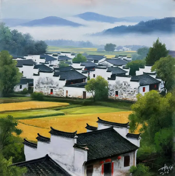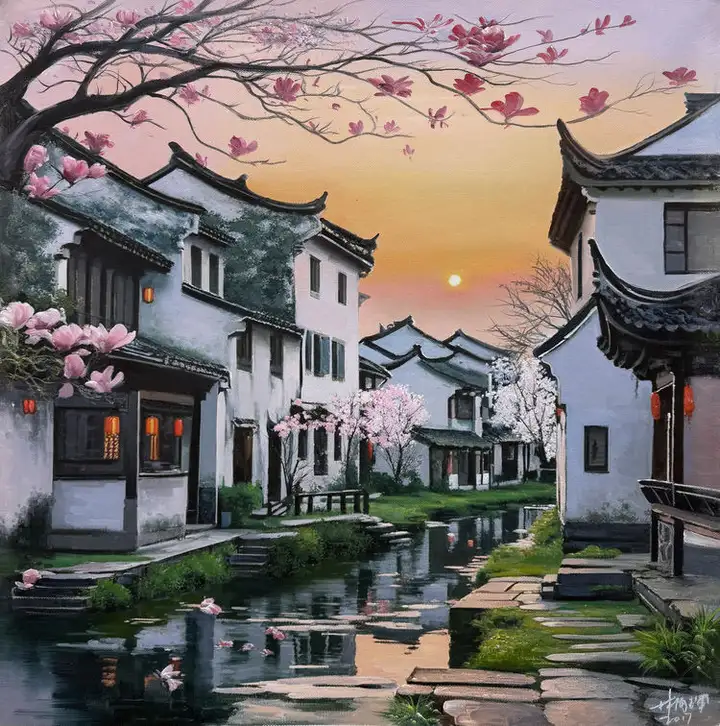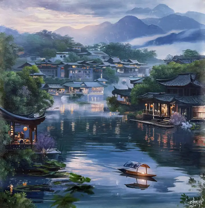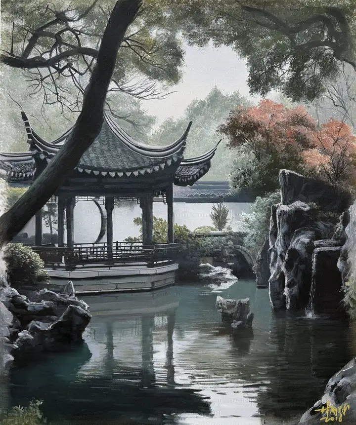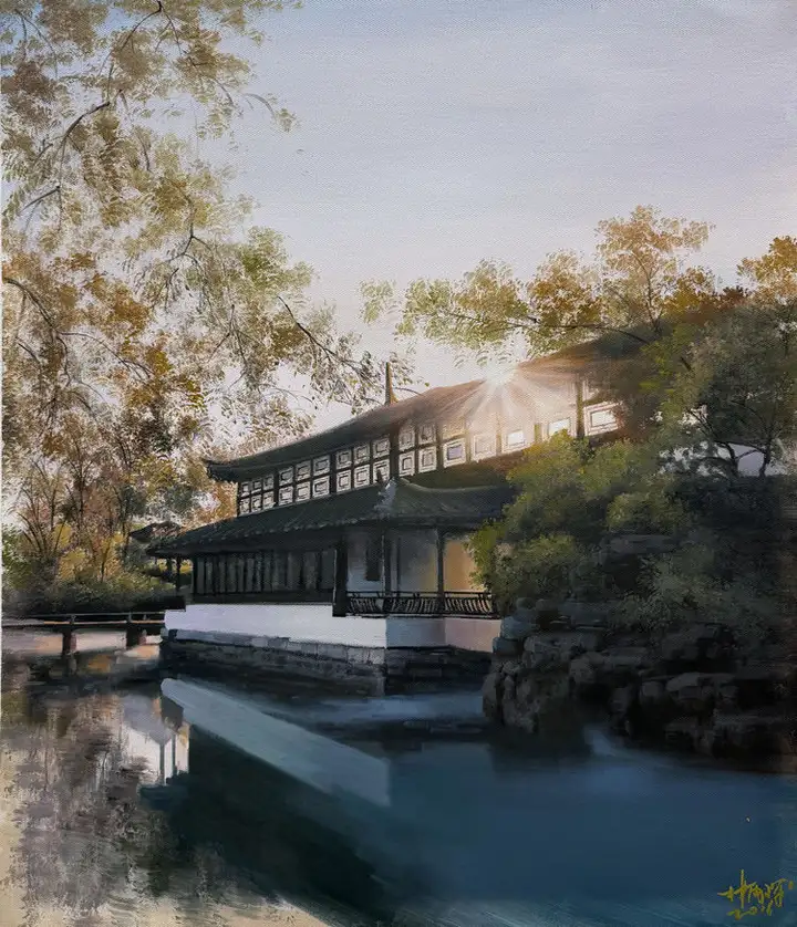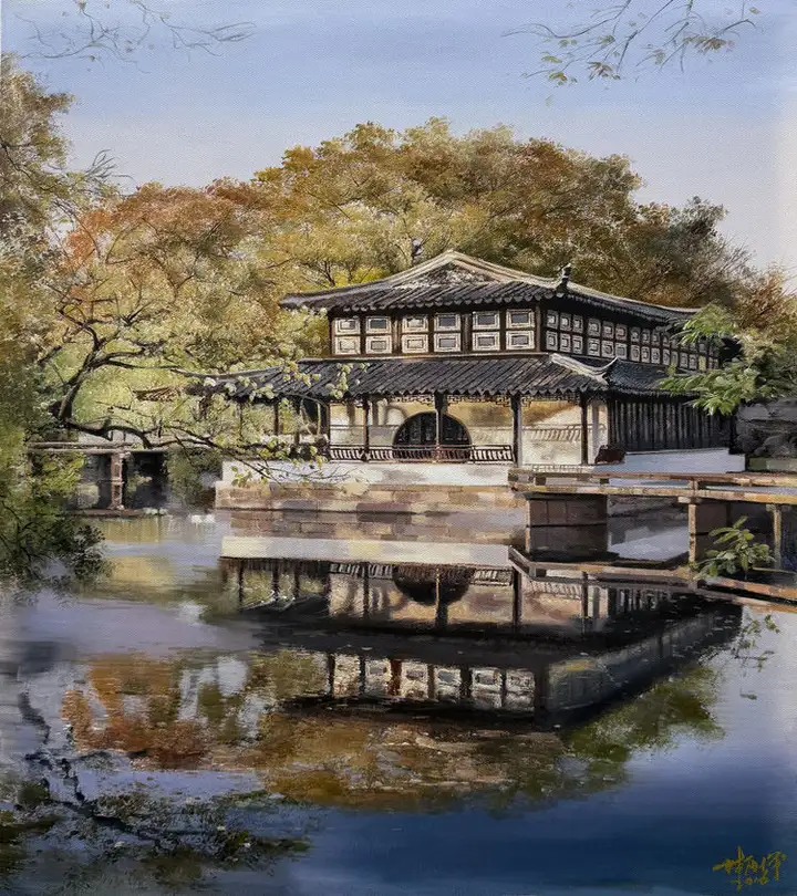 林雨琛的艺术创作始终与中国传统文化深度绑定,古建筑营造技艺与江南民俗文化是其作品的核心母题。2017年,他创作的《滕王阁》《黄鹤楼》《岳阳楼》系列布面油画,以超写实技法精准还原四大名楼的建筑形制与工艺细节,将赣派、荆楚、湘地的古建筑营造非遗技艺凝于画布。其中《黄鹤楼》被人民大会堂管理局收藏,《苏州园林》获故宫博物院永久收藏,《江南水乡》则被中国国家博物馆纳入馆藏,这些作品成为非遗文化当代视觉化表达的典范。