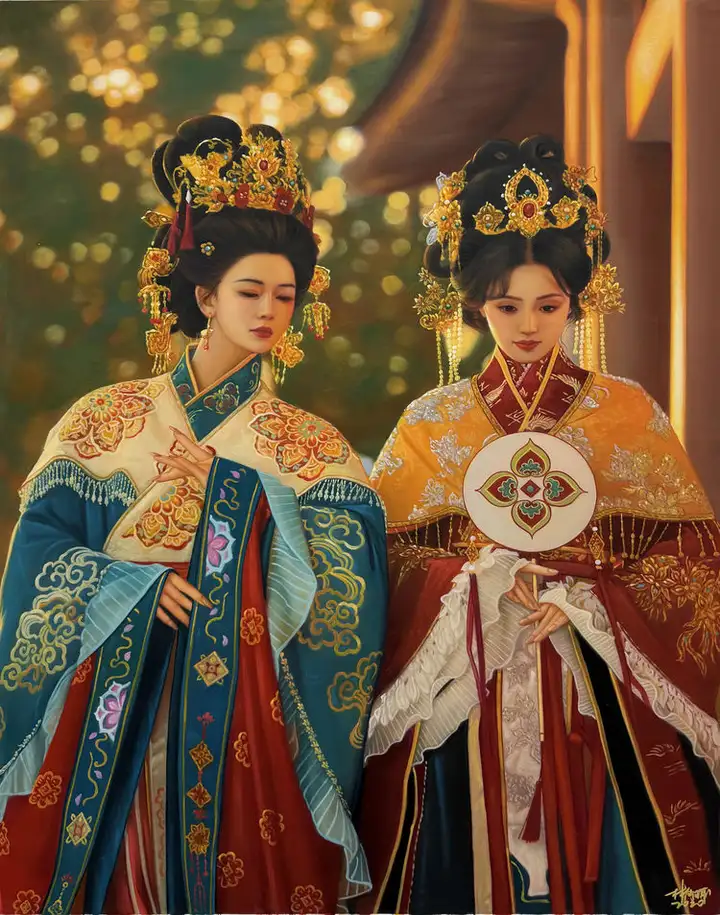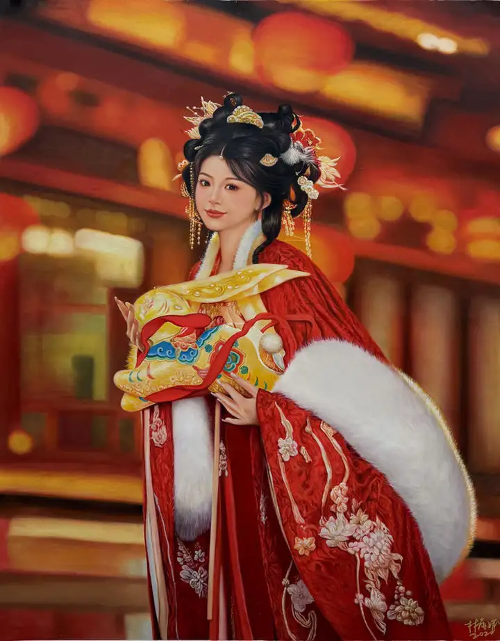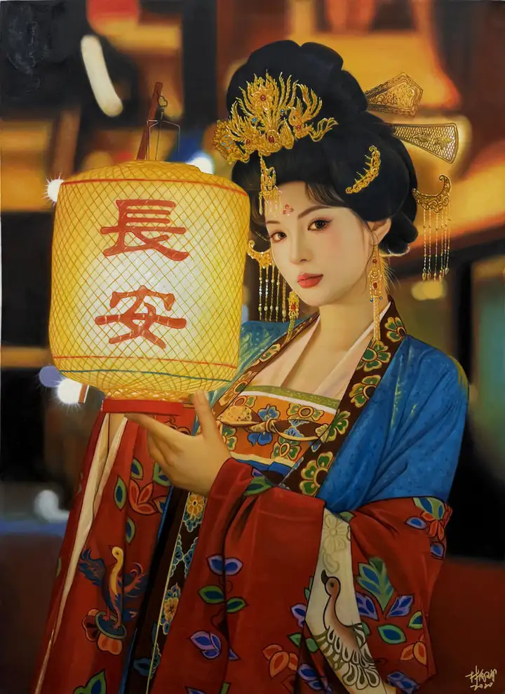 除古建筑系列外,其《大唐风华》《长安》等人物油画,融合唐代服饰制作、古典妆容等非遗技艺,以细腻的笔触勾勒出大唐文化的气韵,《大唐盛世》亦被中国美术馆收藏,让传统非遗技艺跳出博物馆的静态展示,成为可感知、可共情的艺术语言。